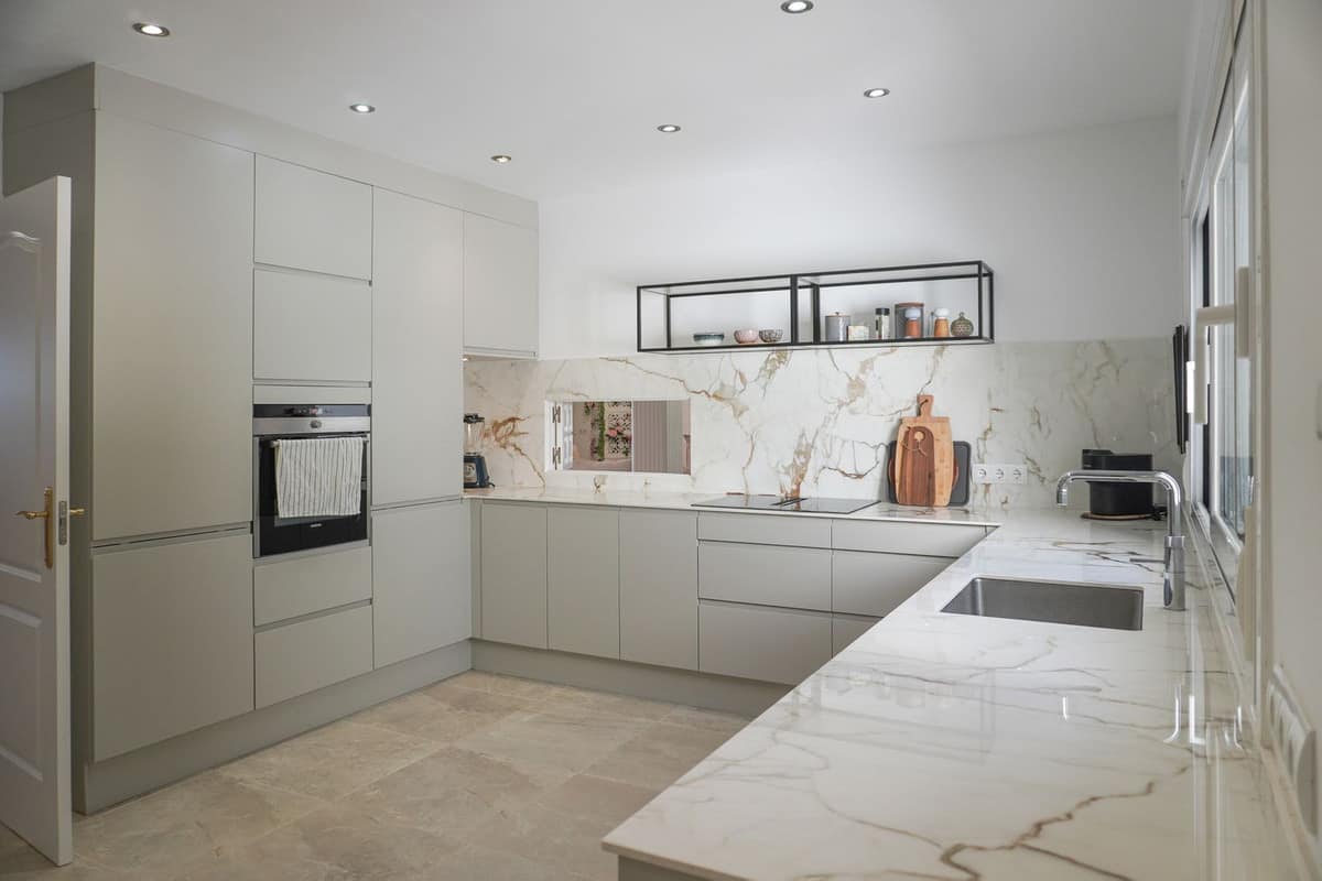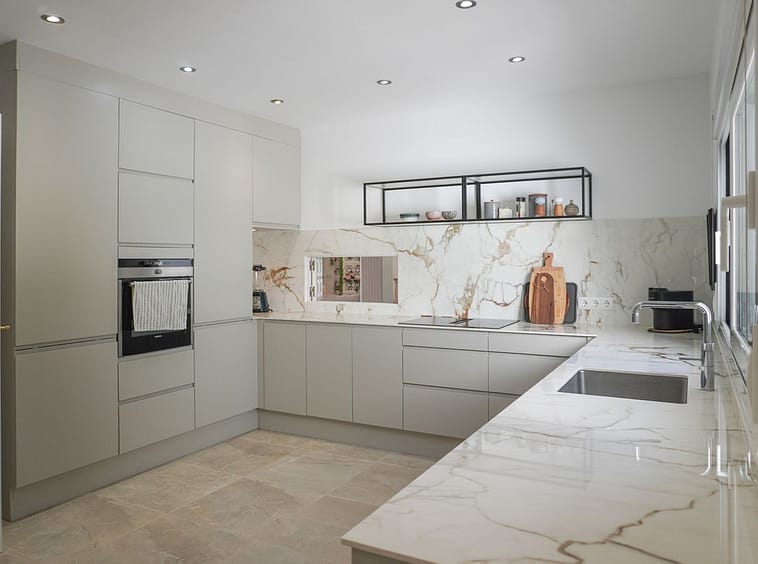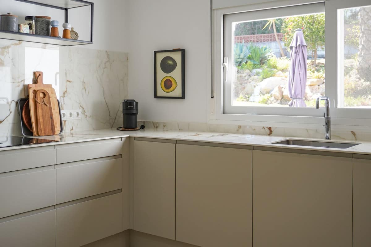 The kitchen was fully renovated three years ago and features Designa Kitchen cabinetry in a Nordic style, with elegant cupboards and drawer solutions that provide both functionality and comfort. The kitchen is equipped with new appliances, including an extra-wide combi refrigerator, a ceramic hob with integrated extractor, new flooring, and a Quooker system providing instant boiling water.