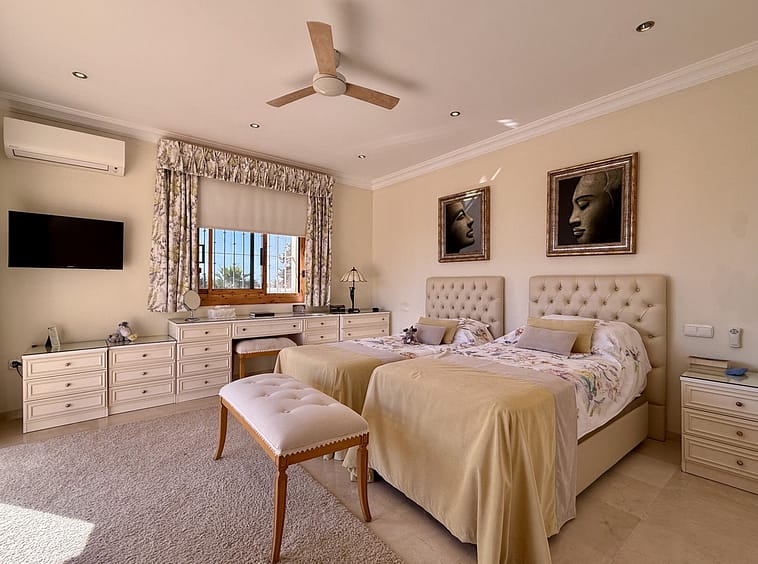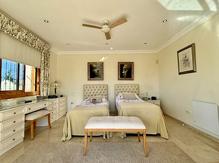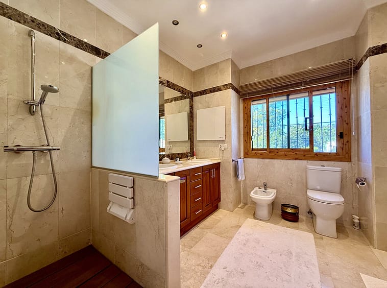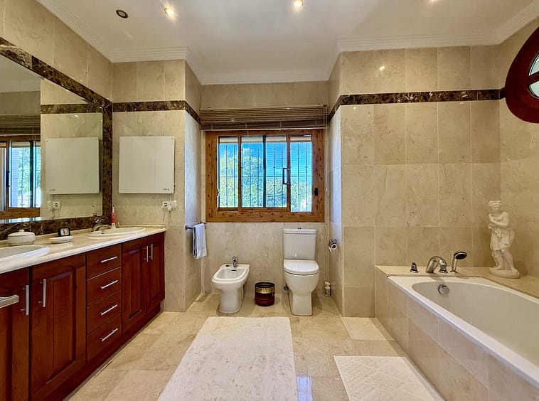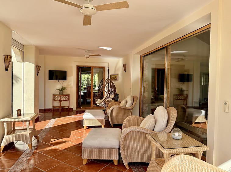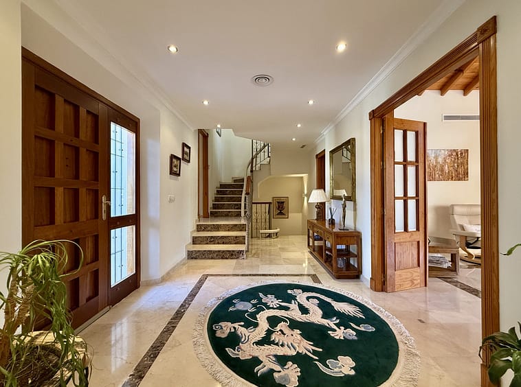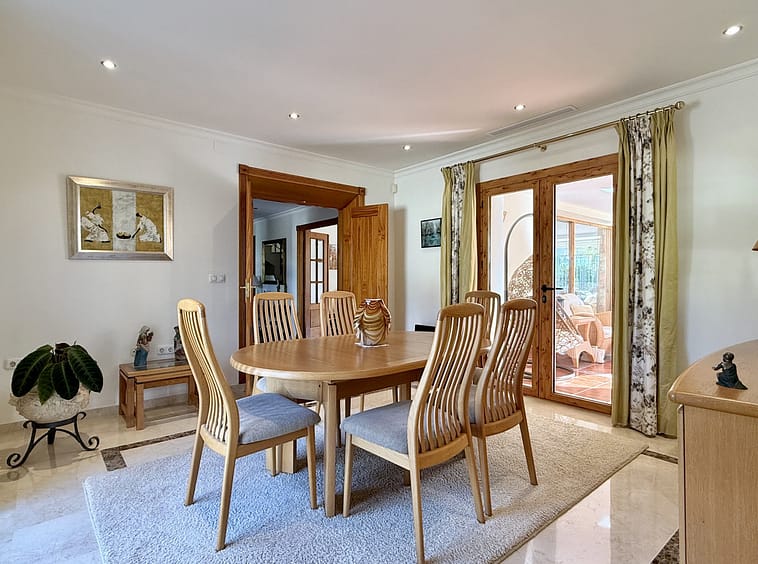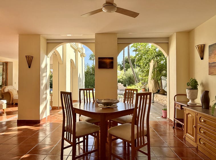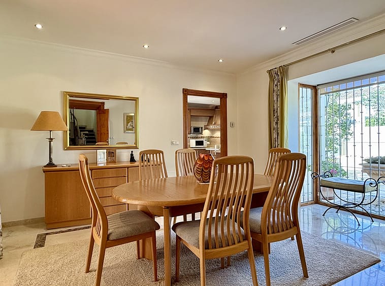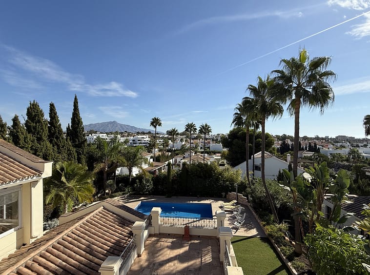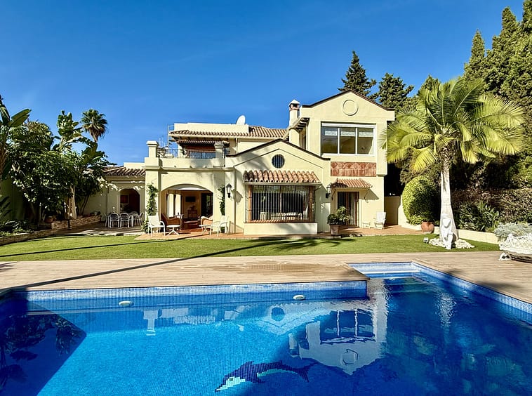 This great property has just come to the market at a very competitive price. It's an Ideal location, walking distance to several commercial centers make it very desirable for those who don't want to take the car to enjoy facilities and restaurants, supermarket, pharmacy, gym or a nice coffee shop. The property is in a lovely condition. The villa has a nice elegant andalusian style. The entrance hall connect to the right with the separate dining room, the fully fitted kitchen ad the large covered and uncovered terrace to the landscaped mature and very private garden and pool. The spacious living room has a high ceiling with wooden beams. On the same level we find two bedrooms with en suite bathroom. A nice stair case bring us up tot he first floor where we find a large and very bright bedroom and the master bedroom with , ensuite bathroom and access to a large very sunny uncovered terrace with lovely mountain views. Going down to the basement we find a games room, a hobby room with bathroom and the very large garage for several cars. Also the utility room. This great family property enjoys a fantastic mature garden and a lovely entrance area. International schools like Atalaya, San José in Guadalmina are just nearby. Proximity to all facilities as several golf courses like El Paraiso, Atalaya or los Flamingos, the beach at 15 minutes walk, The lovely El Campanario sport club with fantastic indoor pool, gym, spa and much more make this a unique family home. A visit is highly recommended.