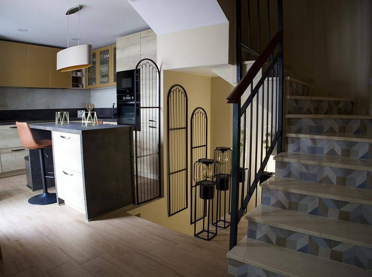 Features a spacious and bright living room with a fireplace, a fully equipped open-plan kitchen with a central island, large windows that provide abundant natural light, and a guest toilet. From this floor, there is also access to the laundry room and the kitchen patio, where a skylight provides natural light to the basement.