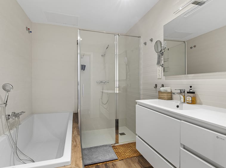 Two of the four bedrooms enjoy ensuite bathrooms, while all benefit from ample storage and natural light. The home is equipped with central heating and air conditioning, ensuring year-round comfort. Outside, the property continues to impress with a covered terrace with beamed ceilings, tiled sun terrace, and a large, private garden facing east—perfect for morning sun. The fenced swimming pool provides peace of mind for families, and the outdoor areas invite relaxed Mediterranean living.
