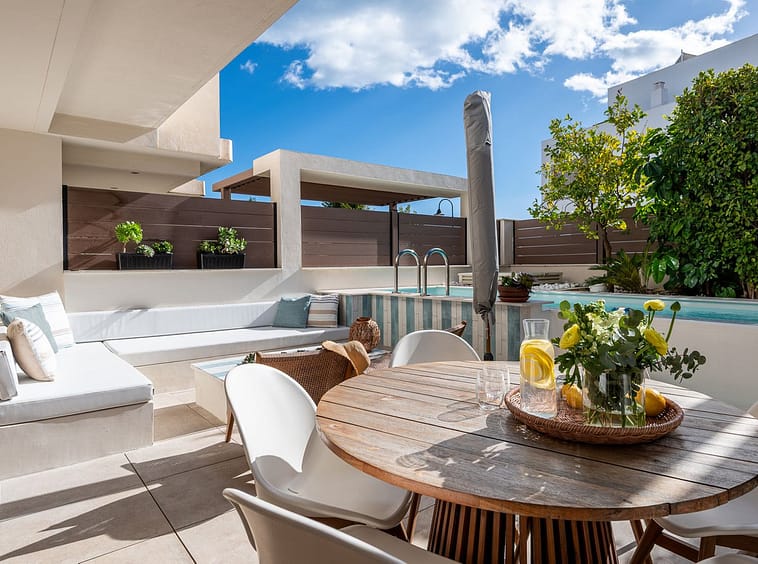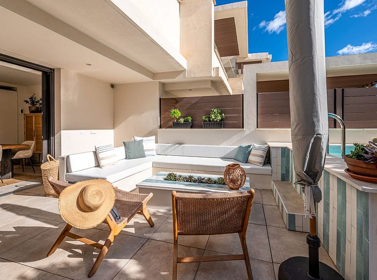 The living area flows effortlessly onto a generous private terrace with its own plunge pool, built-in lounge and outdoor kitchen — a sophisticated setting for long Mediterranean evenings.