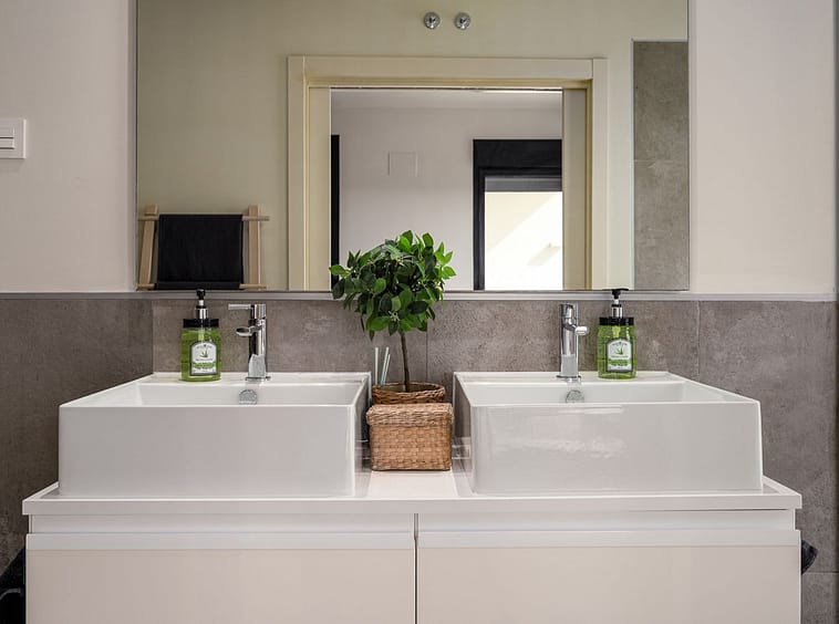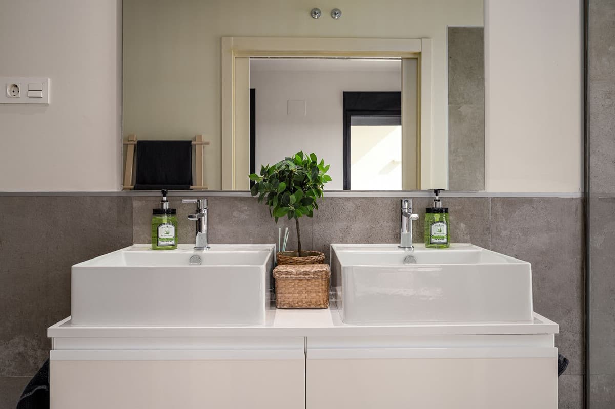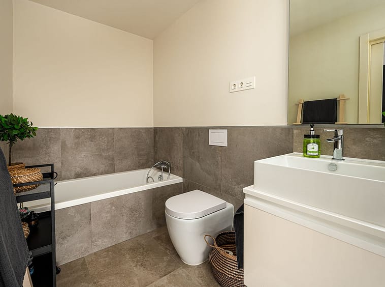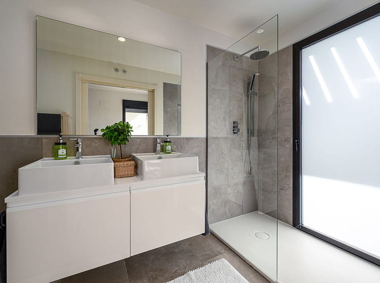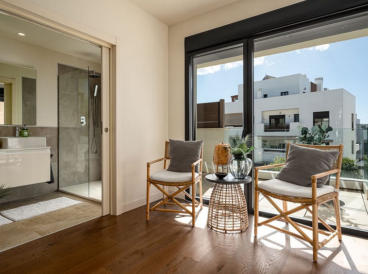 The master bedroom is a sanctuary of calm and refinement — featuring a walk-in closet, a luxurious en-suite bathroom with double vanity, bathtub and walk-in shower, and direct access to a private terrace designed for serene mornings under the Spanish sun.