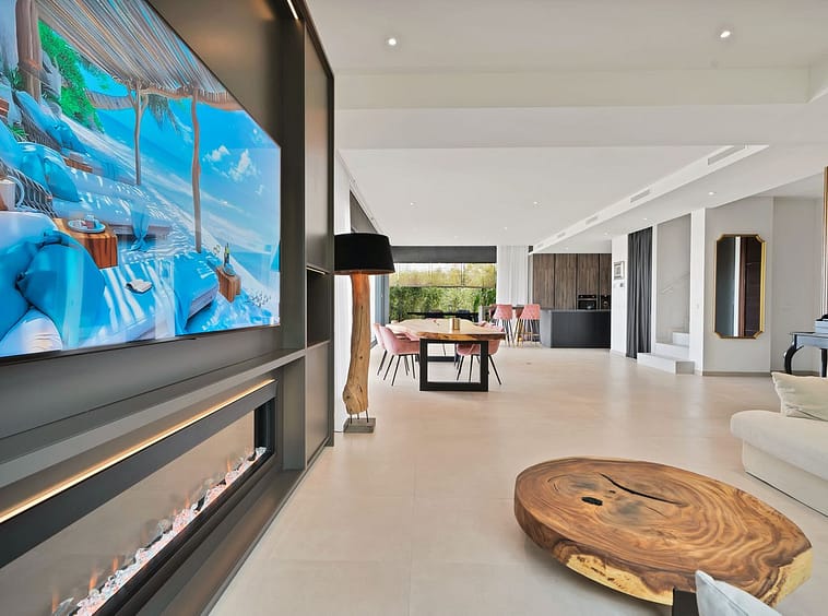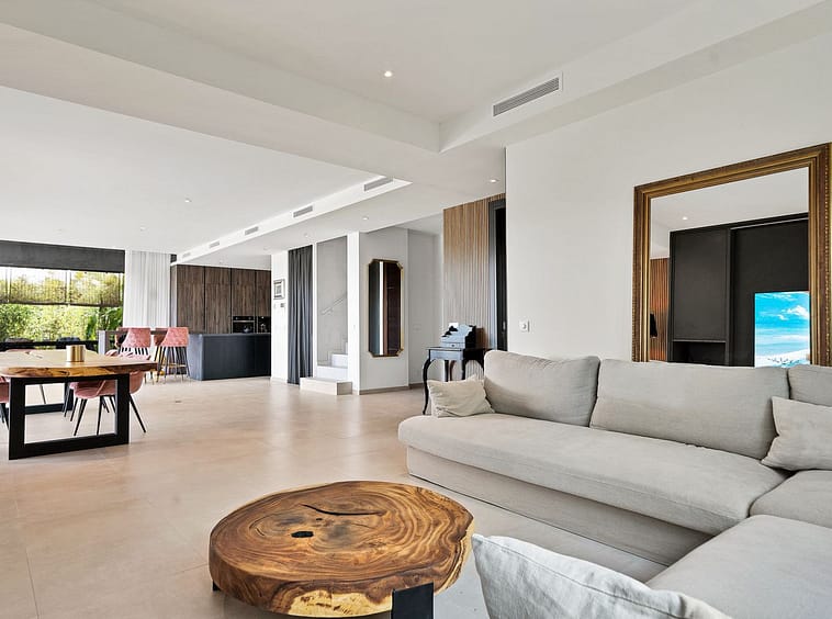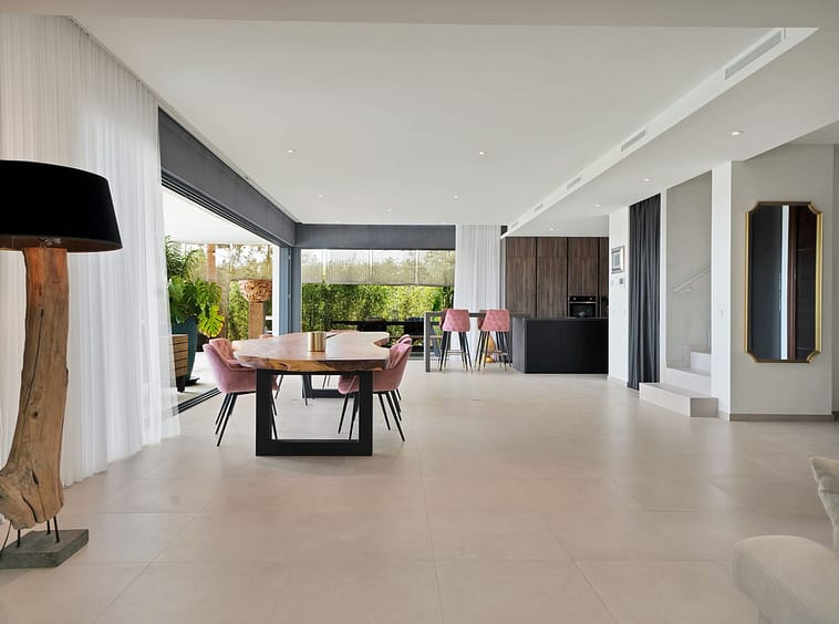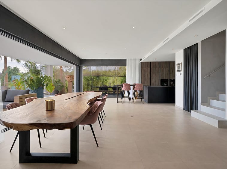 The heart of this stunning home is undoubtedly its open-plan living area, which seamlessly integrates the living, dining, and kitchen spaces into one cohesive and inviting environment. This area opens out onto large terraces, offering breathtaking views and creating an ideal setting for alfresco dining or simply enjoying the beautiful surroundings.