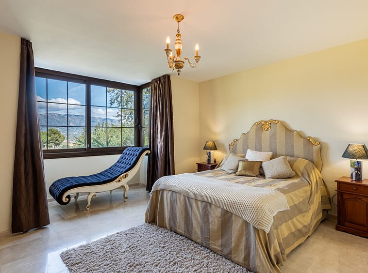 To go downstairs you go to the panoramic window and follow it down to the 2 bedrooms below. Here you also find the huge master bedroom with its own terrace.