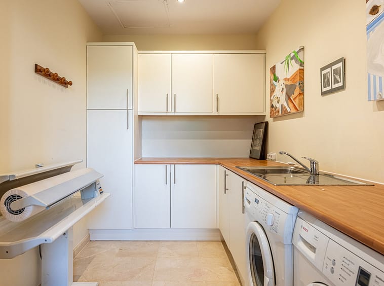 One of them leads to the garden and a lovely pool area. To the right from the hallway, you have two good sized bedrooms and a laundry area.