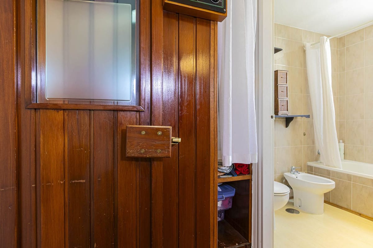 On the ground floor, there is a cozy patio covered with a pergola that provides access to the home. To the left is a guest toilet, and to the right is the generously sized kitchen, opposite the spacious and warm living room with its fireplace. From the living room terrace, there is access to the basement where you can
