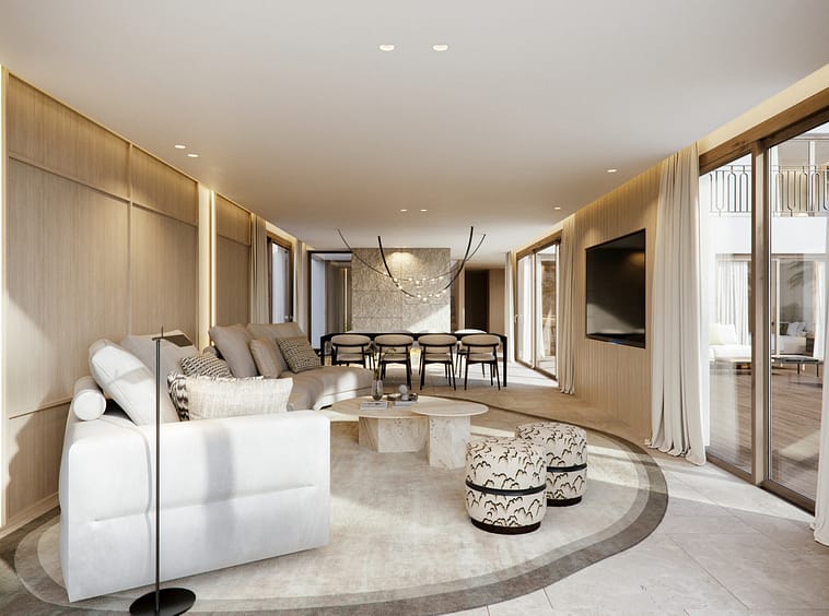 Each villa is thoughtfully designed with elegant white façades, natural stone details and expansive windows that flood the interiors with light. Open-plan living areas flow seamlessly onto generous terraces, landscaped gardens and private infinity pools, creating the perfect indoor-outdoor lifestyle.