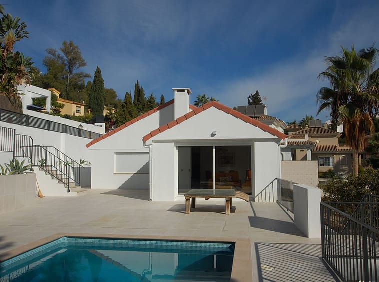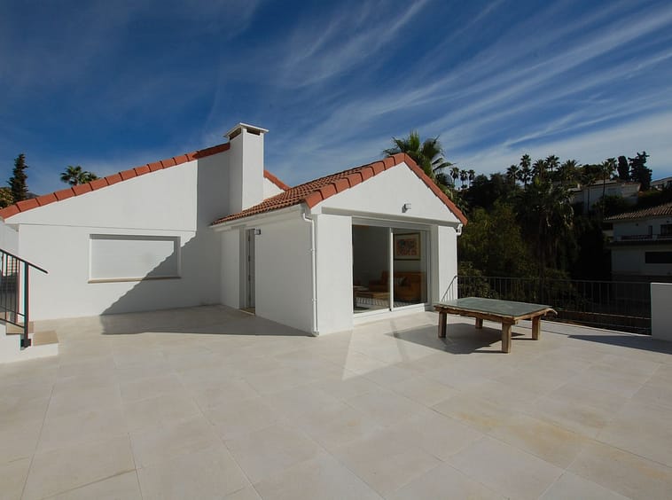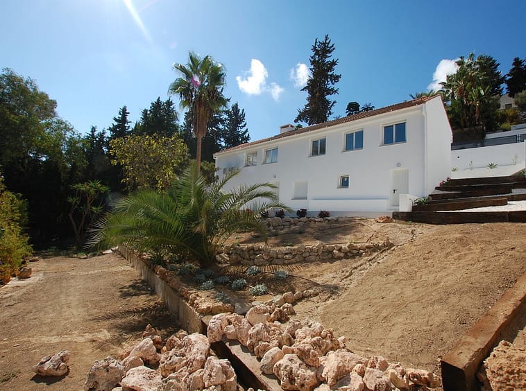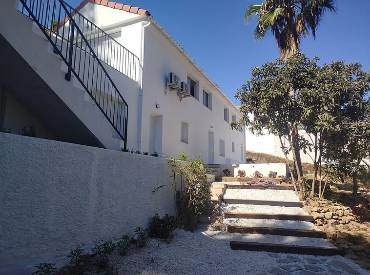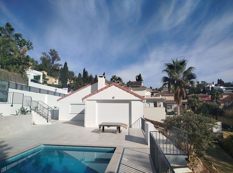 Totally renovated to a high standard and insulated with thermal insulation,you have this luxury 4 bed 4 bath villa in a quiet street in Campo Mijas with landscaped terraced gardens electric gated secure parking electric entrance gate with video entry. There are two large terraces with one surrounding the newly constructed pool. The house has two separate levels with the living room / dining room modern open plan kitchen , 2 large bedrooms both with ensuite shower and bathrooms with under floor heating and guest toilet on the entrance level with another independent bedroom with ensuite showerroom plus a large studio apartment with ensuite and storeroom on the lower level, electric blinds all water electric sewage pipes and wires are new, easy local access to all the bars restaurants of El Coto and Fuengirola set a very quiet area with video entrance and fully alarmed .