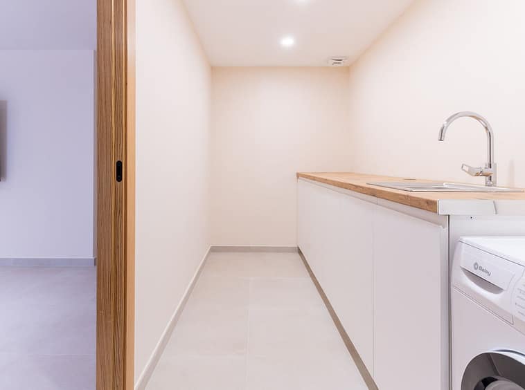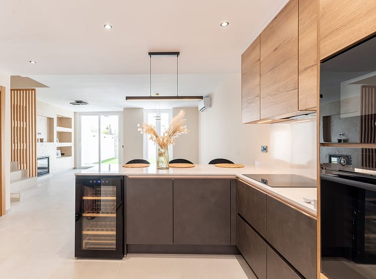 The open-plan living and dining area flows into a sleek, fully fitted kitchen with integrated appliances and a wine cooler. A contemporary fireplace creates a warm focal point, making the space ideal for both everyday living and entertaining. Each bedroom is equipped with fitted wardrobes and en-suite bathrooms. The master suite enjoys its own terrace and generous bathroom, while the top-floor suite features a private terrace and storage – perfect for guests, a home office, or a retreat.