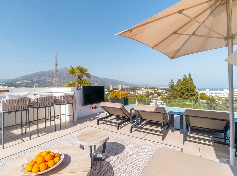 Crafted to blend indoor and outdoor living, the villa offers a spacious covered terrace, perfect for dining and relaxing with family and friends. The custom-designed rooftop solarium with its private plunge pool showcases sweeping panoramic views over the Golf Valley and the iconic La Concha mountain.
