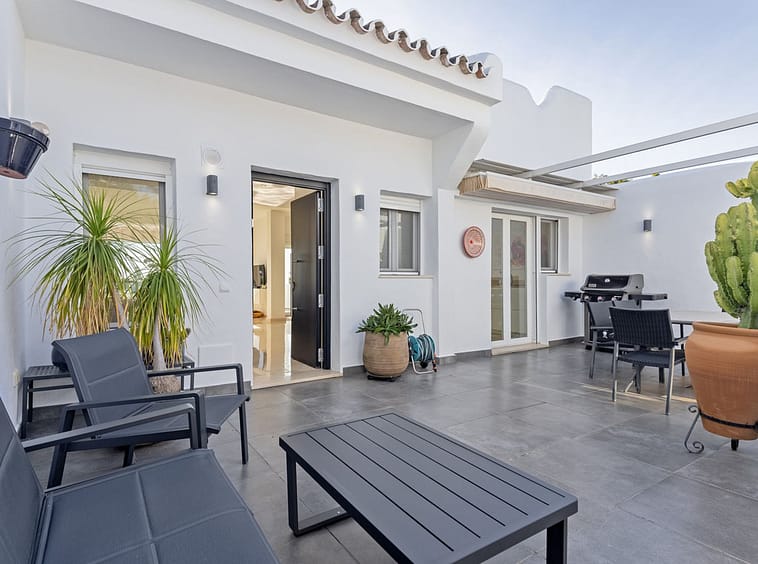Welcome to this stunning corner semi-detached duplex townhouse, perfectly positioned in the heart of the prestigious Golf Valley and offering breathtaking panoramic views over Aloha Golf and the Mediterranean Sea. Located within the charming and tranquil community of La Retranca del Ángel, residents enjoy abundant parking, beautifully landscaped gardens, and a pristine communal pool. The setting is ideal—peaceful yet just moments away from local amenities, the beach, vibrant Puerto Banús, and the renowned Aloha College.