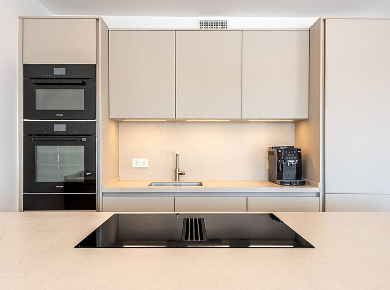 On the ground floor, a bright open-plan layout welcomes you with a stylish living area seamlessly connected to a modern Miele-equipped kitchen. Large sliding doors open onto a spacious terrace featuring an outdoor kitchen and a comfortable lounge area—ideal for relaxing or entertaining. This level also includes a guest bedroom and a full bathroom.