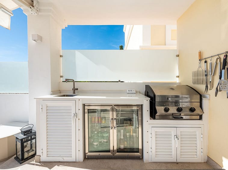 Ascending to the third level, the magnificent rooftop solarium serves as the home’s crown jewel. This luxurious space offers a jacuzzi, a sauna, and a fully equipped outdoor kitchen, all set against panoramic views of Nueva Andalucía and the Mediterranean Sea, a spectacular backdrop for both daytime lounging and sunset gatherings.