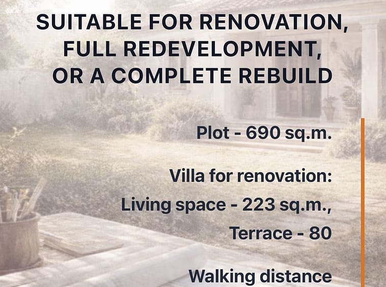 A 223 m² villa set on a 690 m² plot — a renovation project with preliminary works already completed (the property has been partially stripped and windows removed), allowing you to immediately proceed with your own concept without additional demolition costs.
