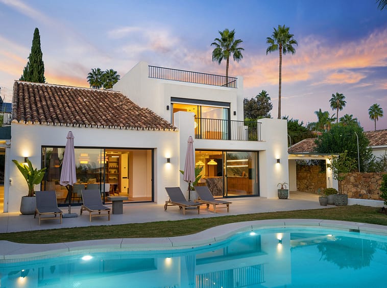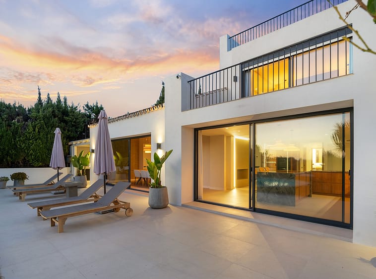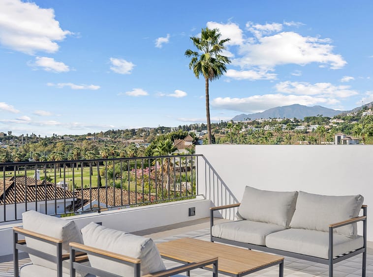 Nestled in the heart of Nueva Andalucía, Villa Vanessa is a stunning Scandinavian-style villa where modern elegance meets timeless design. Benefiting from an ideal southwest orientation, the villa enjoys all-day sunlight and unobstructed panoramic views over the prestigious Golf Valley, complemented by meticulously landscaped and fully private gardens. The main living area is designed for modern luxury living, featuring impressive double-height ceilings, expansive floor-to-ceiling glass doors, a stylish fireplace, and an upscale chef’s kitchen equipped with premium marble countertops and top-of-the-line Miele appliances. Offering four spacious bedroom, the property includes beautifully designed master en- suite bathroom, generous walk-in wardrobe, and convenient direct garden access from the lower level.