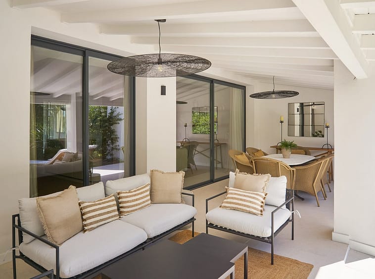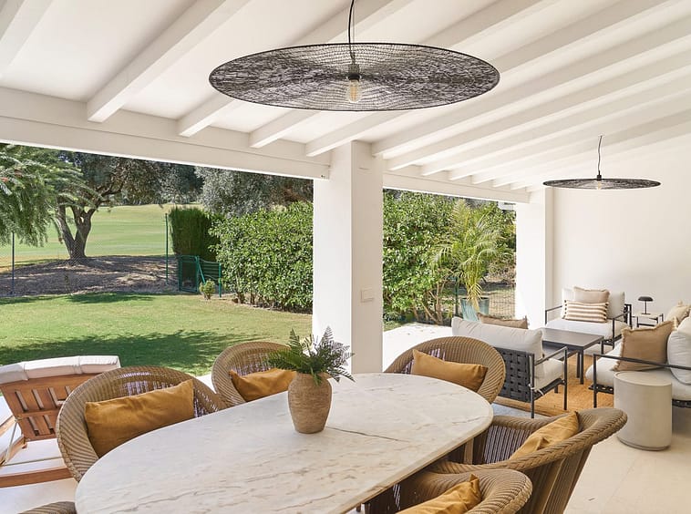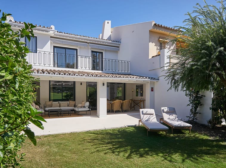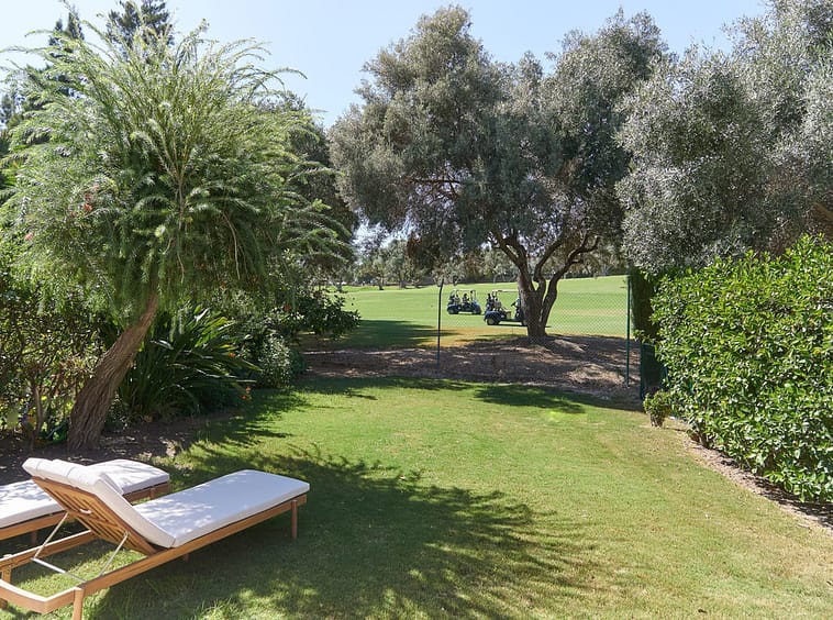The ground floor features an en-suite bedroom opening onto a private English patio which could be transformed to a home gym or cinema. The main living and dining areas, alongside a fully equipped Siemens kitchen, lead to a covered swest facing sunny terrace and private garden with direct views over Aloha Golf, blending indoor elegance with outdoor serenity. The master suite on the top floor boasts an expansive private terrace, ensuite and panoramic vistas of manicured fairways and surrounding landscapes, while two additional bedrooms and a shared bathroom complete this level.