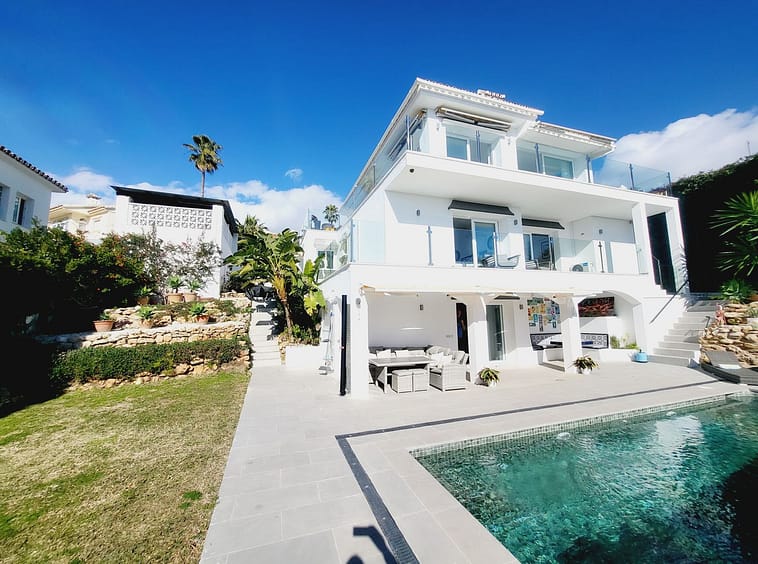 BEAUTIFULLY PRESENTED WITH MANY RECENT UPGRADES BY THE CURRENT OWNERS WHICH INCLUDE: A STYLISH NEW KITCHEN, GLASS AND CHROME BALUSTRADES, REFURBISHED GUEST STUDIO WITH KITCHEN AND SHOWER ROOM, STUNNING NEW POOL AND TERRACES SET WITHIN A LOW MAINTAINANCE AND LANDSCAPED GARDEN. THESE UPGRADES COMPLEMENT PERFECTLY THE ORIGINAL DESIGN AND LAYOUT OF THE PROPERTY WHICH COMPRISES: ENTRANCE AND HALLWAY LEADING TO GUEST CLOAK-ROOM, KITCHEN, OPEN-PLAN LOUNGE AND DINING ROOM AND STAIRS DOWN TO THE BEDROOM LEVEL. THE VIEWS FROM THE LOUNGE AND DINING ROOM ARE A SIGHT TO BEHOLD WITH TWO SETS OF PATIO DOORS LEADING OUT TO A WRAP-AROUND TERRACE THAT ALSO HAS A DINING AREA THAT CONNECTS TO THE KITCHEN.