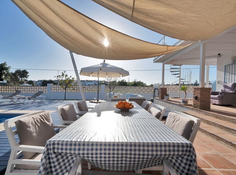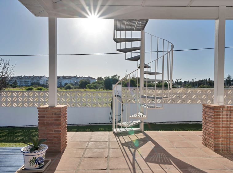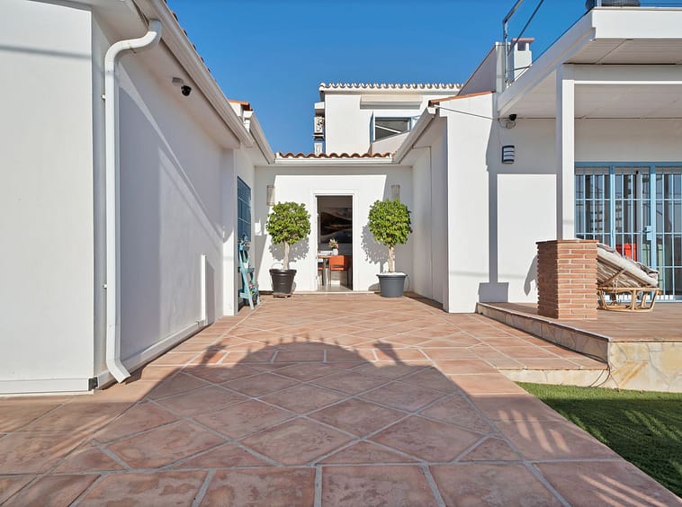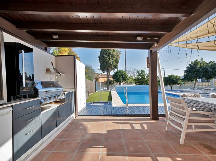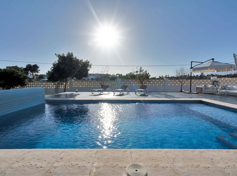 The villa is built on a generous plot of 950m2 which has a well-maintained garden that includes a variety of fruit trees, planters & shrubs. There is a large free to form coverable swimming pool, outdoor shower and there is a very spacious area for entertaining and dining outdoors which has a separate build in BBQ, wine fridge and built-in sink unit. There is a spiral staircase where you can access the upper sun roof terrace to enjoy and capture the most amazing sunsets from here.