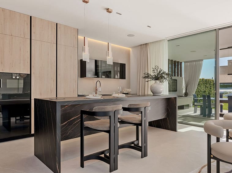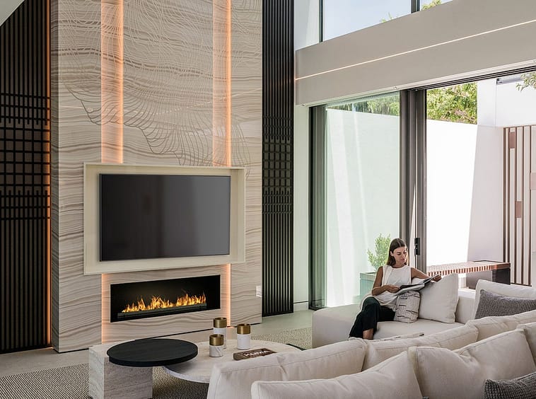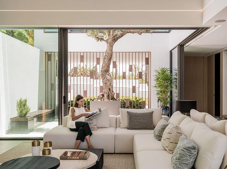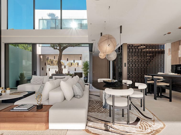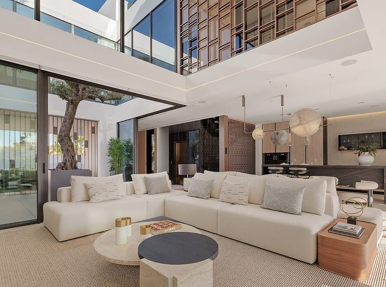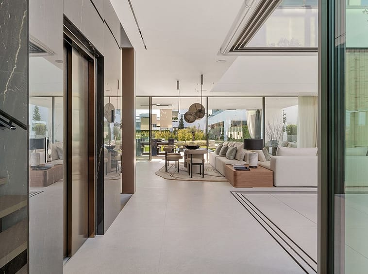 This villa spans four meticulously designed floors, connected by a private elevator. The spacious living area features a dramatic double-height ceiling, creating an airy, open atmosphere ideal for entertaining. This flows seamlessly onto a beautifully crafted terrace, perfect for embracing the indoor/outdoor lifestyle. The interior patio, complete with a mature olive tree, further enhances the villa’s expansive feel, blending nature and design. The state-of-the-art Gaggenau kitchen is a chef’s dream, equipped with top-of-the-line appliances, combining style with practicality.