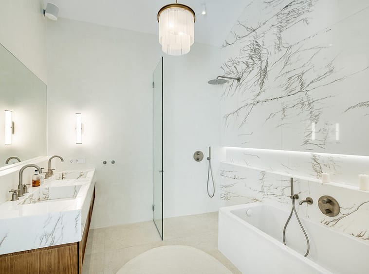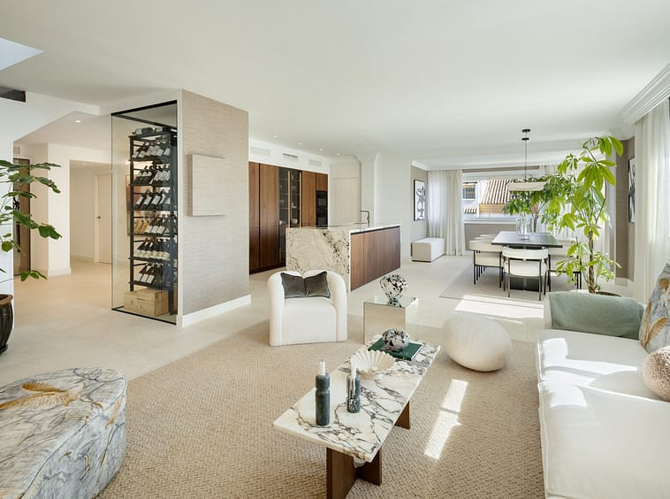 Located in the sought-after area of the Marbella Golden Mile, Costa PH is an exceptional duplex penthouse offering panoramic sea and mountain views. Designed with a modern open-plan layout, the living, dining, and kitchen areas are seamlessly connected, creating a bright and spacious environment. The state-of-the-art kitchen features a striking marble island, elegant wooden cabinetry, and integrated high-end appliances, with a stylish wine rack adding to the aesthetics.