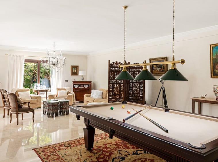 Further from the entrance hall we have a guest WC, a gym area and a 2nd lounge area with access to the cozy covered terrace with view over garden and pool area.