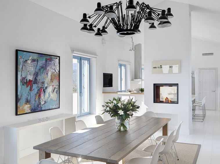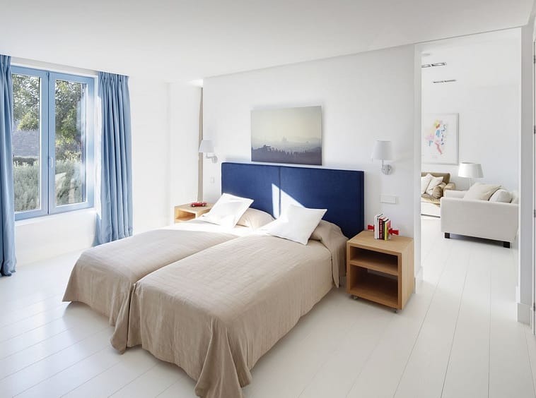From the main vestibule, we descend one level where there are 4 large bedrooms with en suite bathrooms and all with direct access to the luscious gardens and swimming pool beyond. On this level, there is also a full gymnasium and Sauna, bodega and in house cinema, with hospitality kitchen by Siematic, and games area. The closed garage comfortably accommodates 4 cars and there is also a separate laundry room. The adjacent landscaped gardens are carefully manicured and surround the infinity pool with outdoor kitchen and BBQ by Siematic with seated area. For cooler evenings guests can also enjoy a second fire pit area in the garden.