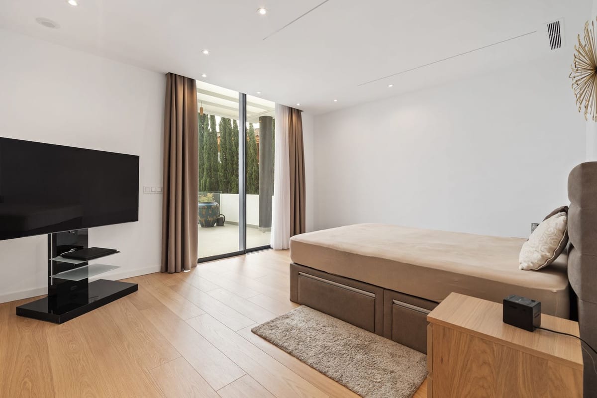The property has a total built area of 980 m², along with 152 m² of terraces. Its south-west orientation allows sunlight throughout the day and opens up views across the golf course, gardens, and surrounding mountains and sea. Inside, the villa features five spacious bedrooms and seven bathrooms, all finished to a high standard.