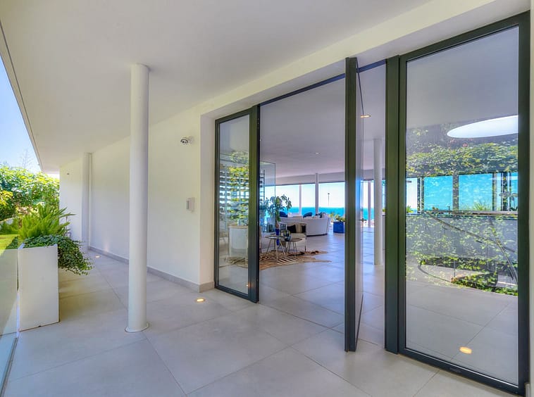 Contemporary designer villa with breathtaking views towards the sea. The villa comprises of two floors with main entrance on the upper level. From the moment you step through the front door, you are struck by the fantastic view thanks to the floor-to-ceiling glass doors along the whole front side of the house. The upper floor is characterized by an open floor plan that houses a kitchen island, integrated kitchen cabinets, dining area and sofa group. In the middle sits a glass wine cabinet. On this floor is also the master bedroom with bathroom en-suite and private dressing room. Outside the large glass doors is a lovely covered terrace that leads out to a wooden deck and lawn. From the wooden deck, a three-meter-wide staircase leads down to the 67 m2 pool with Jacuzzi. The villa's two floors are connected by the specially designed staircase, which is the jewel of the house. On the lower level there are four bedrooms, each with an en-suite bathroom with glass walls, a guest toilet, a TV-room with a small kitchen and a fireplace, a laundry room and a large double garage. Three of the four bedrooms and the TV-room have access to the wooden deck next to the pool where, in addition to space for sun loungers and a dining table, there is an outdoor kitchen, barbecue and toilet, all protected by roll-up canvas roofs. The villa is equipped with air conditioning, under floor heating, alarms, security cameras, home automation, etc. The villa is located on one of the best plots in the exclusive Reserva del Higueron urbanization on the border between Fuengirola and Benalmadena only 15 minutes from Malaga International Airport. In the area there is the 5-star Hotel Hilton, sports club with gym, spa, padel and tennis courts and a Michelin restaurant.
