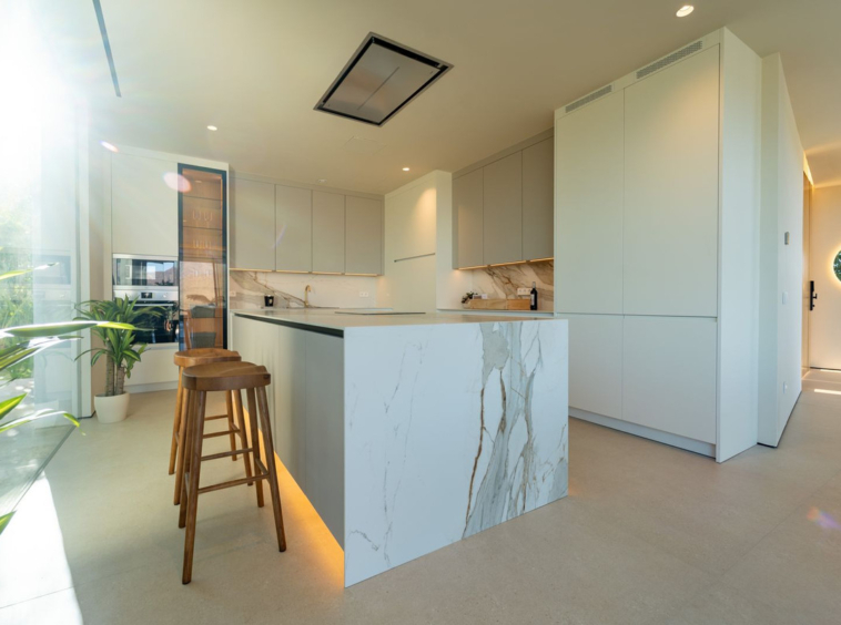 The first floor hosts a spectacular master bedroom with two walk-in wardrobes and a luxurious en-suite bathroom. There is also a second en-suite bedroom. An exterior staircase takes you up to the dream-like solarium, featuring a jacuzzi and outdoor lounge area, where you can soak up the sun all day and admire jaw-dropping views.