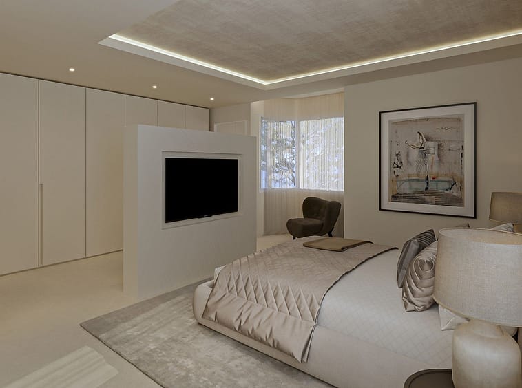 One bedroom is currently configured as an intimate cinema and games room with a large-screen TV, sound system and ambient LED lighting, and can easily be converted back into a full fifth en-suite bedroom. Lighting has been carefully designed, with most ceiling and ambient lighting installed on dimmer systems to create flexible atmospheres throughout the home.
