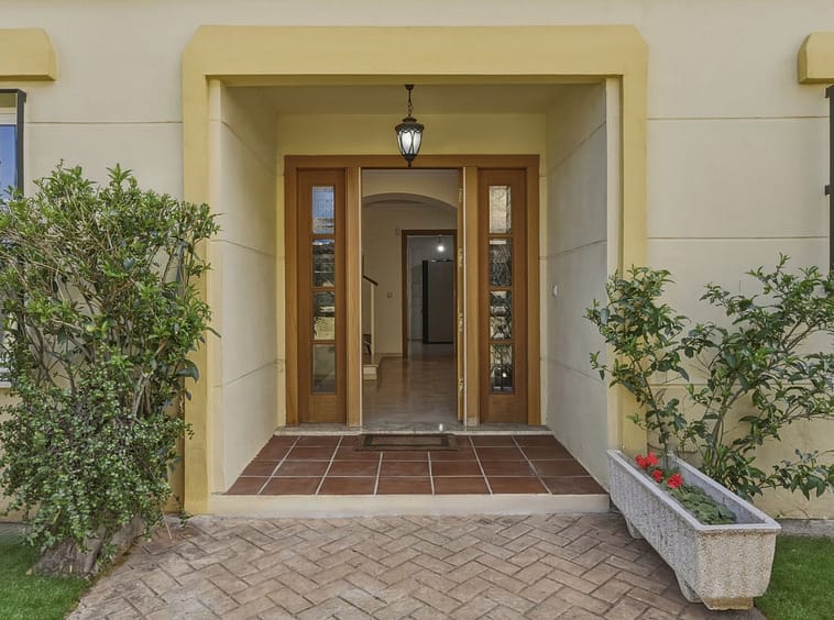 The villa features marble flooring throughout, air-conditioning units providing heating and cooling, a private electric vehicle charging point, and is located in a peaceful residential setting with no community fees.