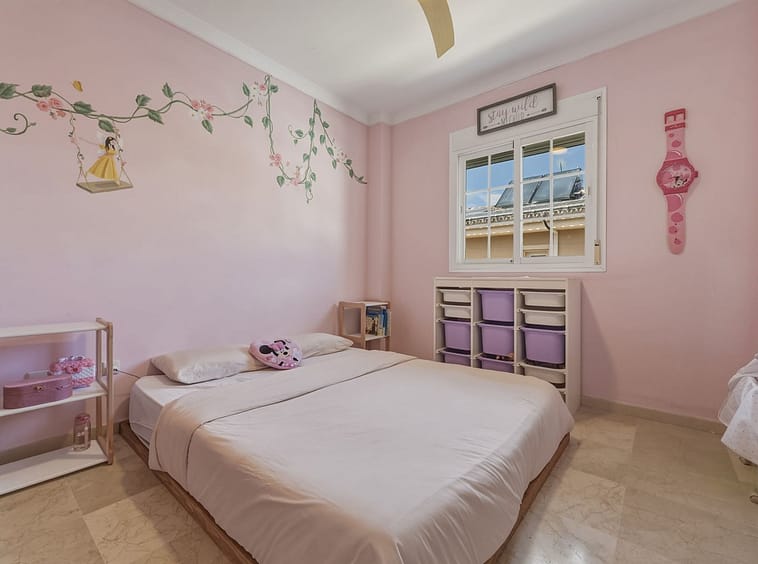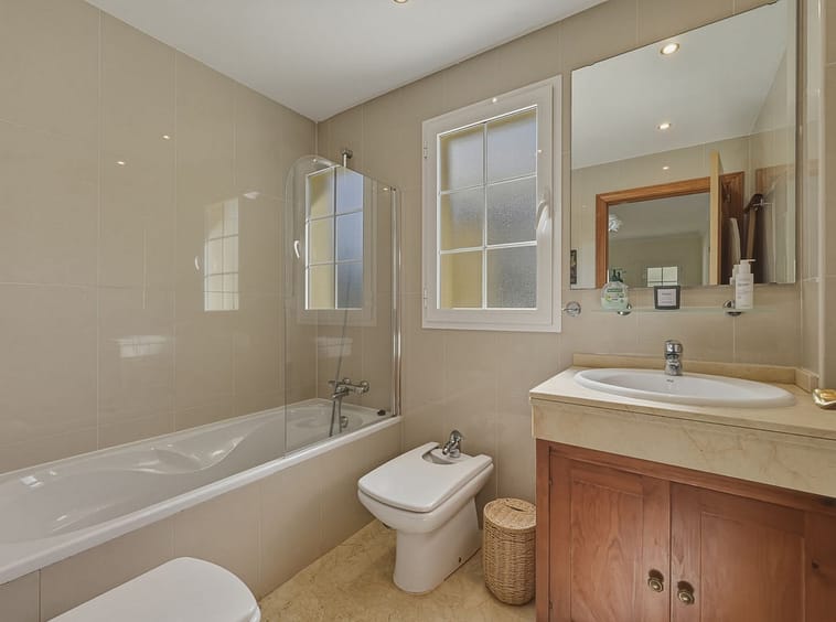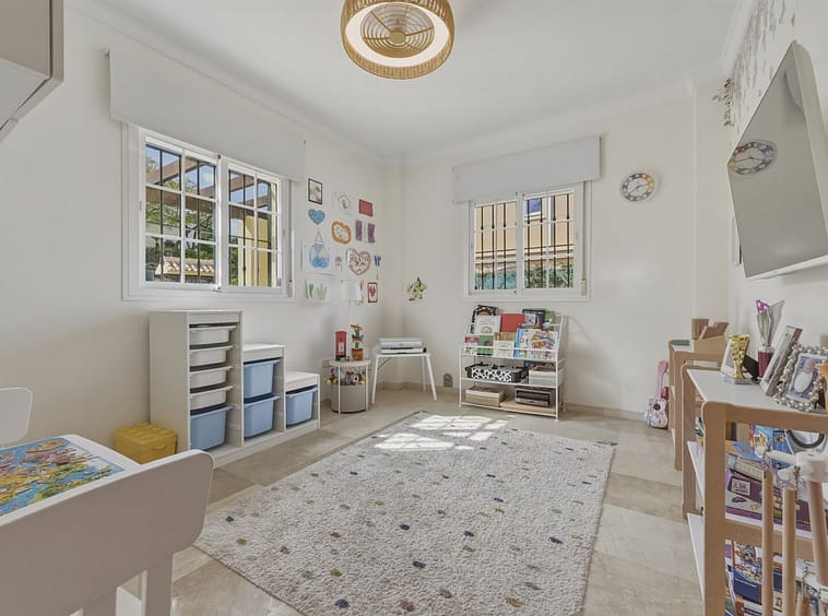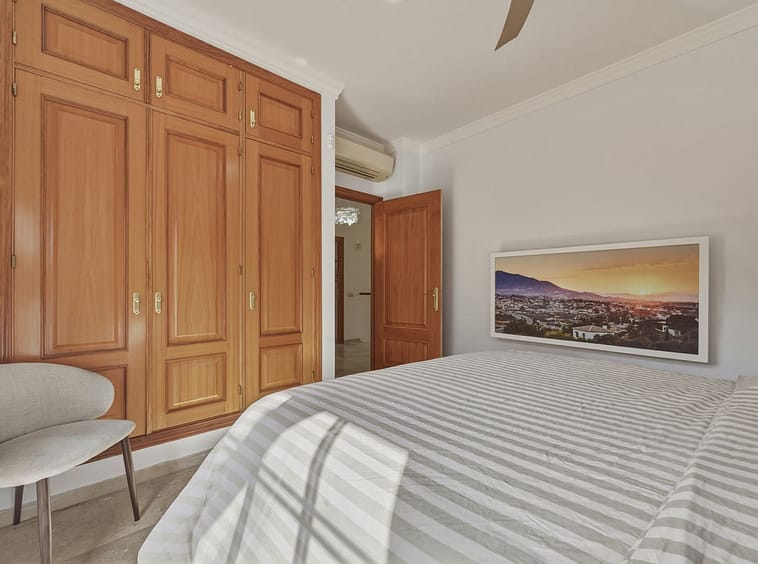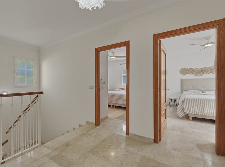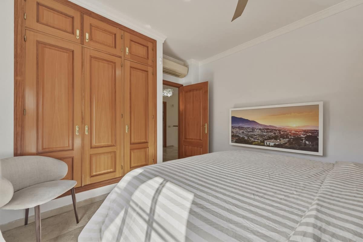 The upper floor comprises four spacious bedrooms and two bathrooms, including a generously sized master bedroom positioned on the corner of the house. The master benefits from two separate windows and open views towards the Mijas mountains, providing excellent natural light. One additional bedroom enjoys access to a private balcony. All bedrooms are well sized and suitable for comfortable long-term use.