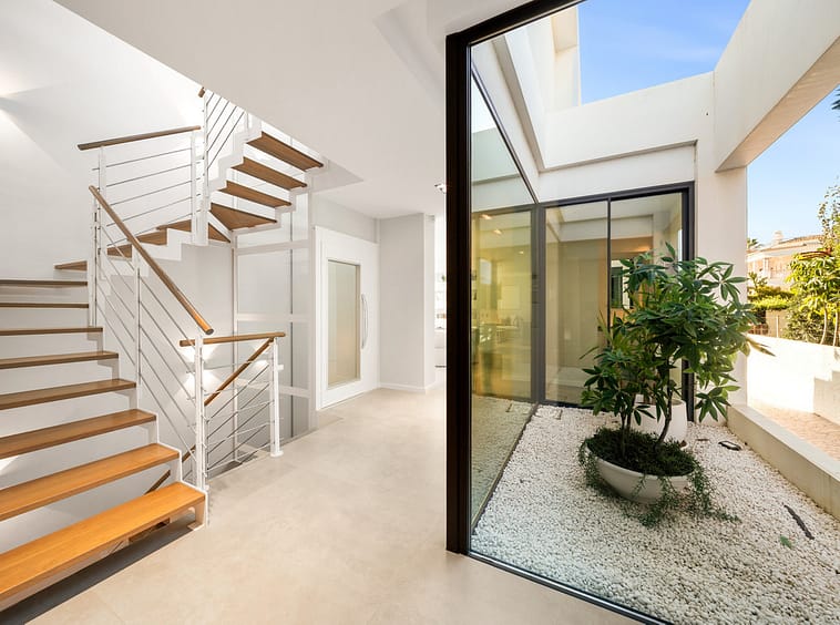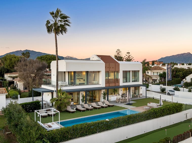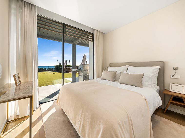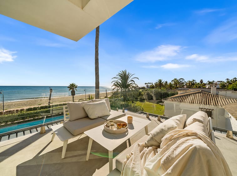 Boasting of panoramic sea views, a contemporary showpiece villa sitting in a privileged beachfront position in the New Golden Mile, surrounded by an expansive private garden with a large private swimming pool. The ideal family estate offering a dynamic outdoor lifestyle, perfect for water sports enthusiasts, with direct access to the beach from the front garden.
