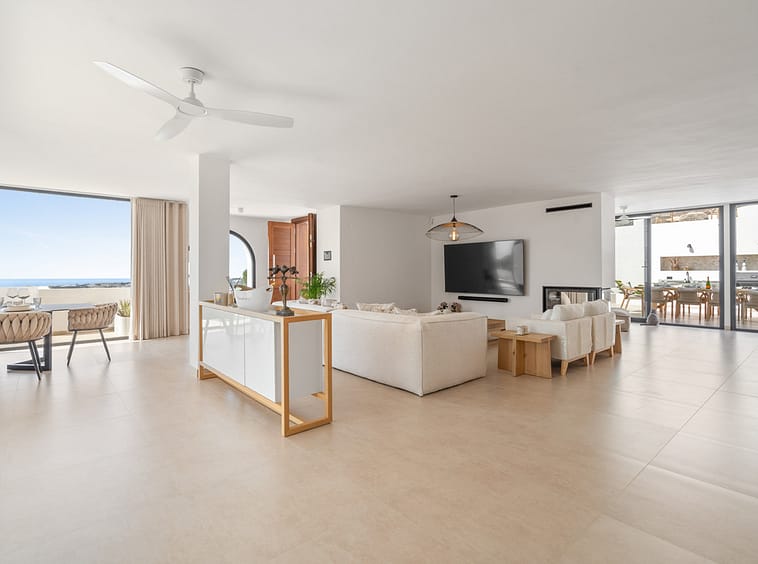 The architecture emphasizes clean lines and openness. Large windows in main living areas and bedrooms fill the home with natural light while capturing the sea and mountain views from multiple vantage points. Living and dining areas are arranged to establish visual clarity while connecting directly to the outdoor terraces.