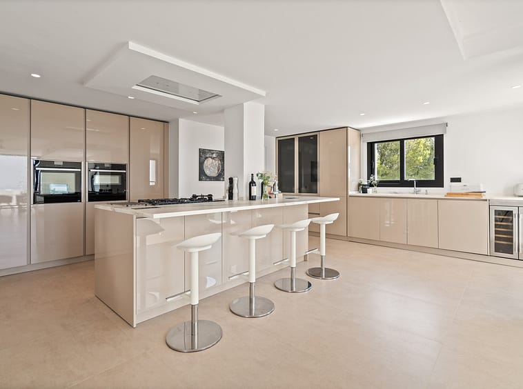 The kitchen features integrated appliances and minimalist cabinetry, blending functionality with a streamlined aesthetic. The primary suite includes a tailored dressing area, en-suite bathroom, and access to a private terrace with full southern exposure and uninterrupted views.