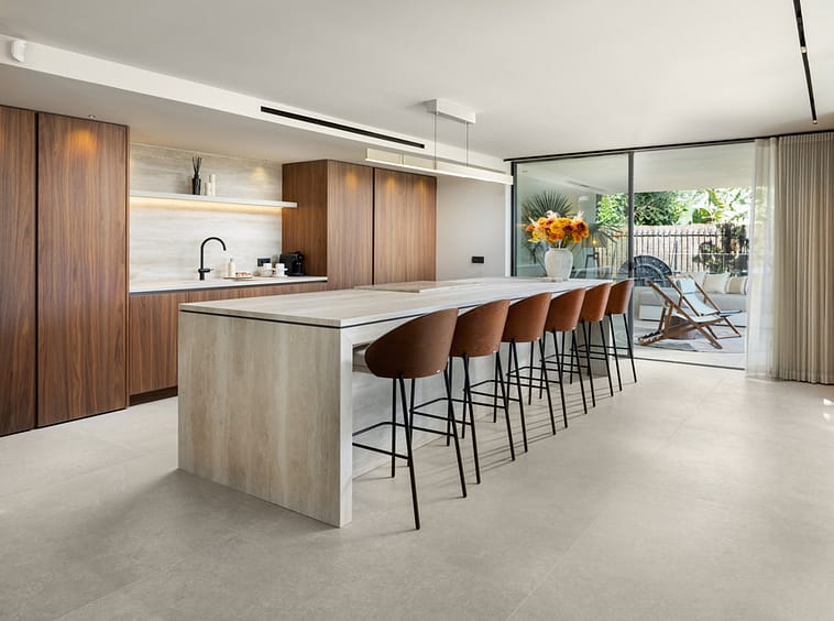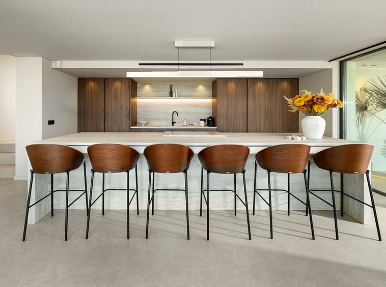 The sloping ceilings and large windows flood the spaces with natural light. The interior design combines clean lines and natural finishes in neutral tones with noble materials, creating an atmosphere of serene elegance. The architectural layout favours a perfect integration between the interior and exterior spaces. Upon entering the property, you will find spacious, bright, and welcoming living areas with high ceilings, which share the limelight with the fully equipped kitchen.
