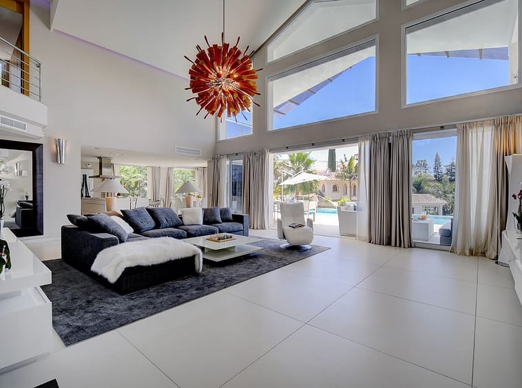 This stunning 5 bedroom villa is now for sale in the exclusive Golf Valley area of Nueva Andalucía. Nestled in a beautiful residential enclave overlooking the popular Los Naranjos Golf course, this modern villa is the epitome of chic living. Offering 5 large double bedrooms all with their own bathrooms, a gym, a fabulous cinema room, garage with parking for 2 cars and a further 4 car spaces outside, this villa really has it all. Spread out over three levels there are 2 bedrooms upstairs, 3 bedrooms on the ground floor and a gym, cinema room and laundry room downstairs. The main living area on the ground floor is made up of a beautiful and large, open plan modern kitchen with dining area that flows into the spacious sitting room, with its stunning double height ceilings, which in turn leads straight out onto the west facing terrace and pool area. Although this house is modern in style it has a lot of details that give it a character not often seen in modern villas. From the beautiful, wooden, double sized front door and the floor to ceiling glass of the sitting room, to the stunningly colourful Italian glass chandelier, and to the contrasting clean sharp lines of the kitchen, this villa is a clever mix of styles that lends a real warmth to this home.
