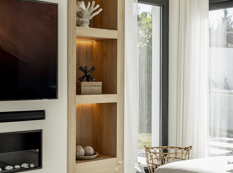 The main living spaces connect easily to the outdoor areas, allowing for a relaxed and open atmosphere. Large terraces offer plenty of room for outdoor dining, sunbathing, or simply enjoying the surroundings. The garden has been designed to be easy to maintain while still providing a pleasant setting around the house. An outdoor gym area adds a practical feature for anyone who values an active lifestyle without leaving home.