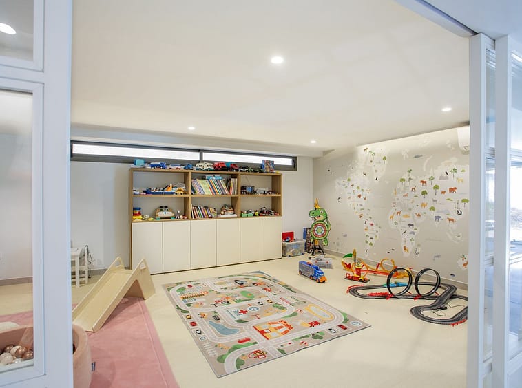 (4) Walking downstairs we have a totally renovated basement space that has been transformed into a fully equipped gymnasium with rest room, kids playroom / customisable space, home-cinema, storage areas and a laundry room.