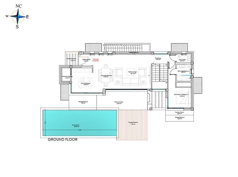 On the ground floor we find: an open plan living, dining and kitchen space with outdoor terraces, a small storage room, a guest bathroom and the guest en-suite bedroom with its private terrace.