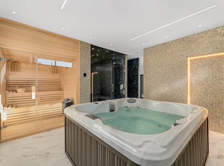 The lower floor is a true sanctuary of leisure and wellness, with a wine cellar, private spa, Finnish and Turkish saunas.