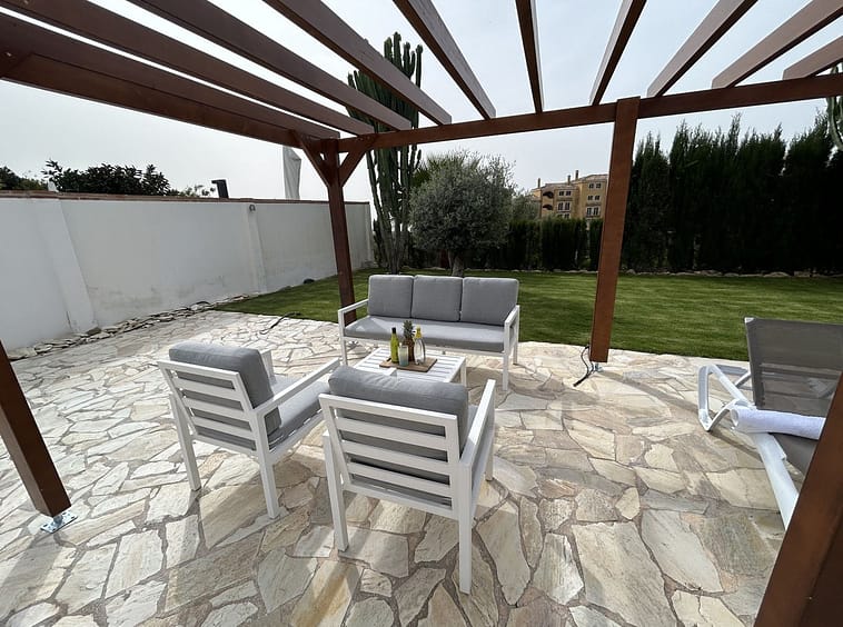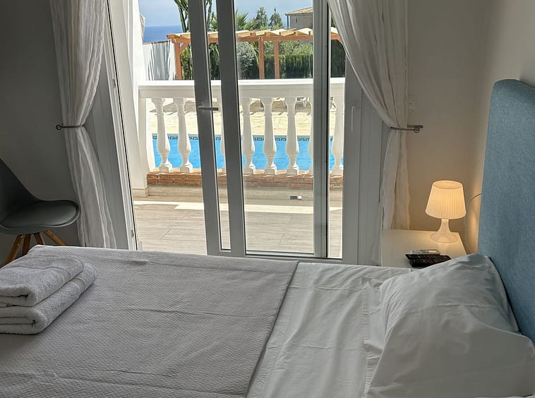 Ground Floor: Three bedrooms, one of them with an en-suite bathroom (shower) and direct access to the covered terrace, pool, and garden. The other two bedrooms have access to the terrace, pool, and garden, and share a bathroom with a bathtub.