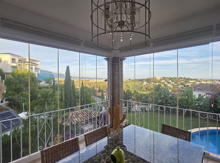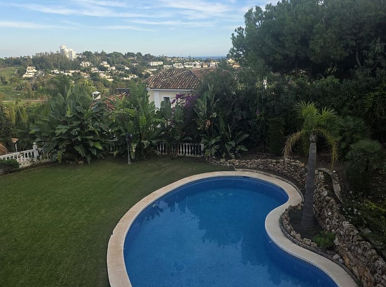 The villa sits on a 2,000 m² plot and features a swimming pool, spacious garden, and orchard with avocado and lemon trees. Its elevated position provides views of the golf course, mountains, and sea.