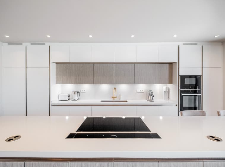 The property features an elegant entrance hall leading to a spacious living and dining area with fireplace, creating a warm and inviting atmosphere. The modern designer kitchen is fitted with bespoke cabinetry, Neff appliances, and a stylish Silestone countertop. From the living area there is direct access to the large terrace, the landscaped private garden, and the impressive swimming pool. The pool is finished with beautiful emerald-colored gresite tiles and has pre-installation for heating, while the garden offers a peaceful and private outdoor space ideal for relaxing or entertaining.