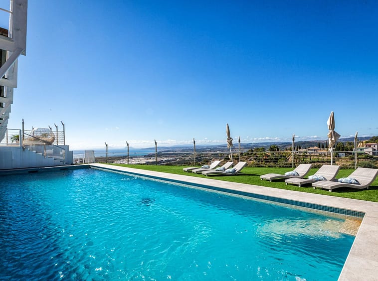 Magnificent contemporary-style villa, located just a 5-minute drive from the center of Estepona, in a privileged natural setting offering complete privacy and panoramic views of the sea, mountains, Gibraltar, and Africa. The property sits on a large plot of 15,500 m², of which 12,000 m² are completely flat, providing ample space for stables and a riding arena, tennis court, and other recreational or sports possibilities. The estate features around 30 olive trees, allowing for the production of your own olive oil, and a pine forest that enhances privacy and the natural charm of the surroundings. The property is situated at 200 m above sea level, offering 280º panoramic views.