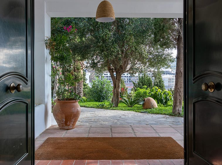 Multiple terraces, interior patio with fountain and mature citrus trees, glazed porch with panoramic sunrise views year-round, summer dining area for up to 14 guests with outdoor kitchen and guest toilet. A separate 35 m² garden studio (currently used as a yoga room) sits within a 230 m² garden area and has independent street access—ideal as an office or creative space. The mature garden features species over 40 years old.