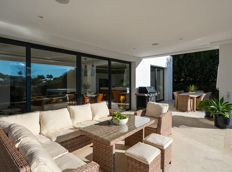 The villa opens onto beautifully landscaped gardens, multiple terraces, a private swimming pool, and a panoramic rooftop solarium, creating a seamless indoor–outdoor lifestyle with all-day sun exposure and spectacular sunset views. An elegant bioclimatic pergola with a fully equipped outdoor kitchenette makes alfresco dining and entertaining effortless.
