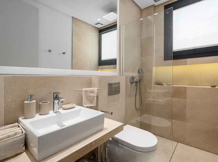 The main living areas follow a bright open-plan concept, integrating a sleek designer kitchen, dining area and spacious lounge with direct access to the terraces and garden. Floor-to-ceiling glazing floods the interiors with natural light and reinforces the connection to the outdoor spaces. A private lift connecting all floors adds both luxury and practicality, enhancing accessibility throughout the home.