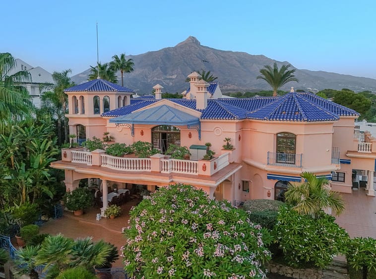 Gracefully positioned in Aloha, Nueva Andalucía- one of Marbella’s most coveted addresses, this west-facing landmark residence sits on a 3,400 m² plot and captivates with its grand, refined appearance. Its 1,727 m² of interiors showcase soaring double-height ceilings, intricate woodwork, and hand-finished marble, creating spaces of enduring beauty and sophisticated character.