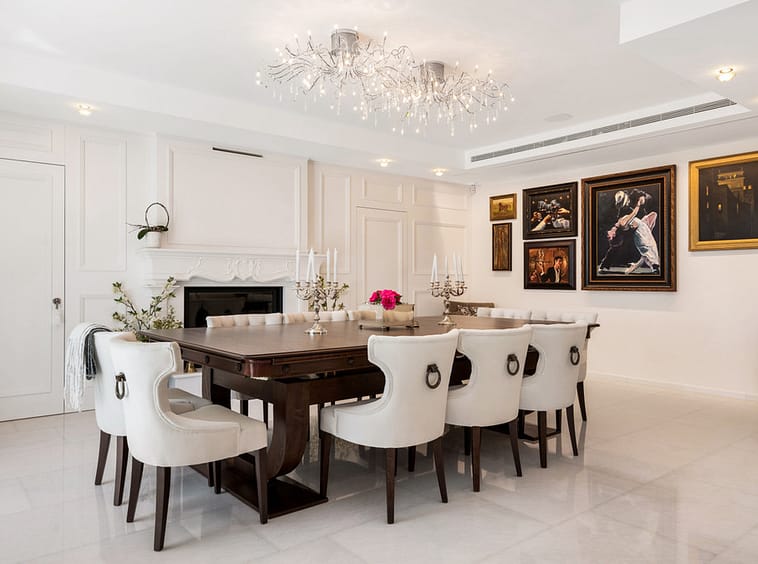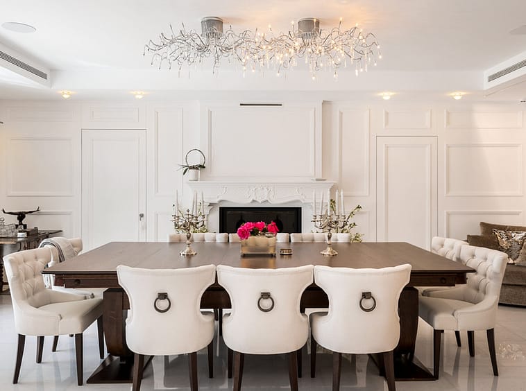 The home’s main living area features a stylish curved sofa set around a sleek fireplace, built-in shelving with accent lighting, and large framed artwork that adds warmth and character. A separate formal dining room includes a long wooden table with upholstered chairs, twin chandeliers, and another fireplace, creating a refined setting for entertaining.